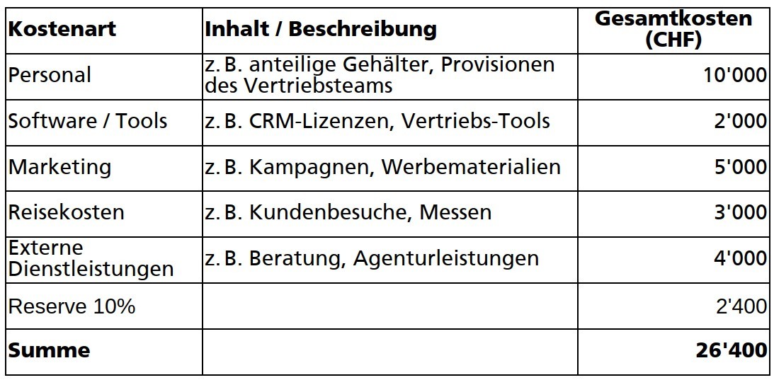 Diese Tabelle verdeutlicht, wie das Budget eines Vertriebskonzepts aufgeteilt sein kann. Jeder Posten enthält einen Reservesockel, sodass am Ende hier etwa CHF 26’400 eingeplant würden statt nur CHF 24’000. Gerade die Personalkosten (interne Ressource) machen in diesem Beispiel fast die Hälfte des Budgets aus – ein guter Hinweis, wie essenziell es ist, interne und externe Ressourcen vollständig zu berücksichtigen. So entsteht ein belastbarer Finanzplan, der als Teil des Vertriebskonzepts die wirtschaftliche Machbarkeit untermauert.